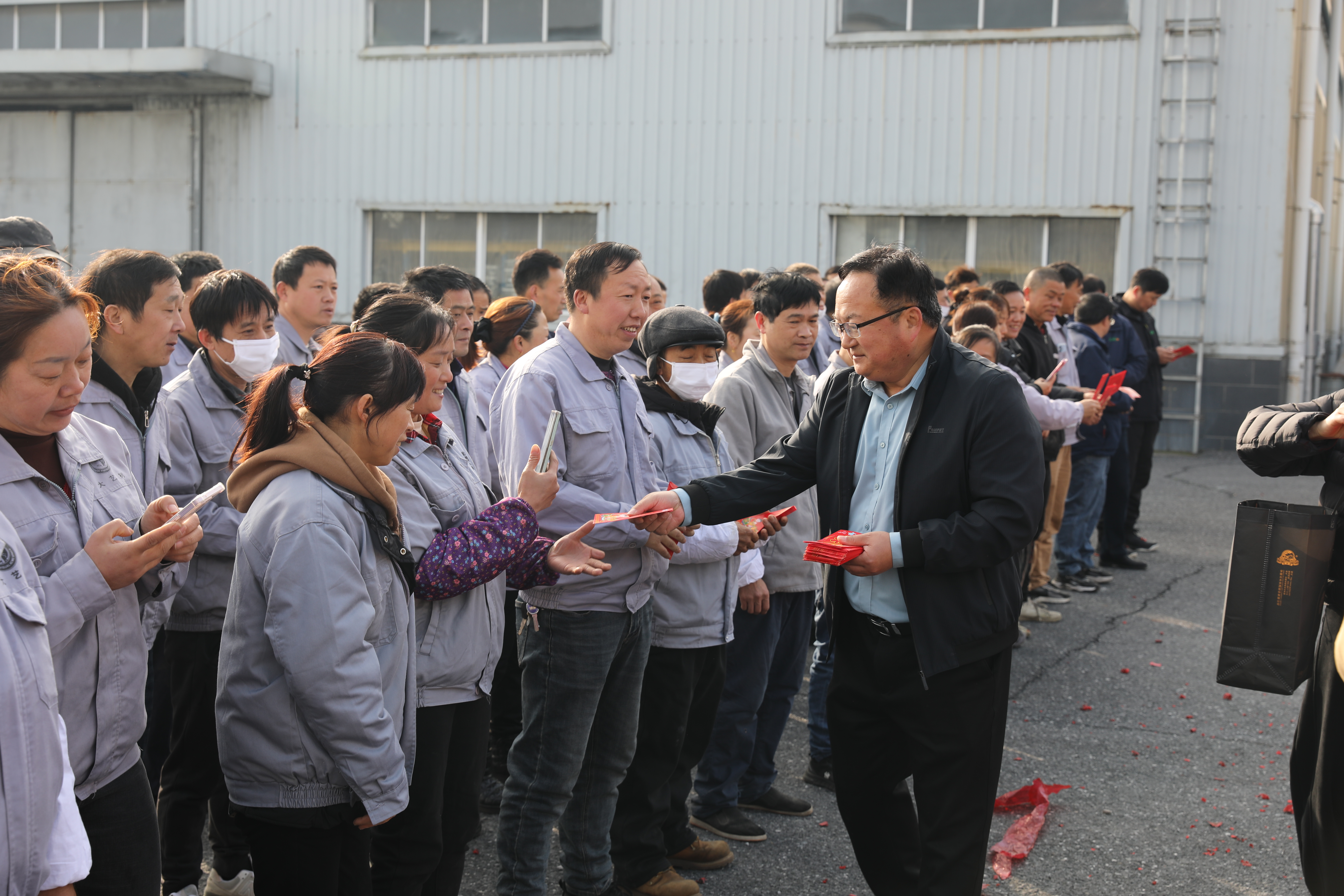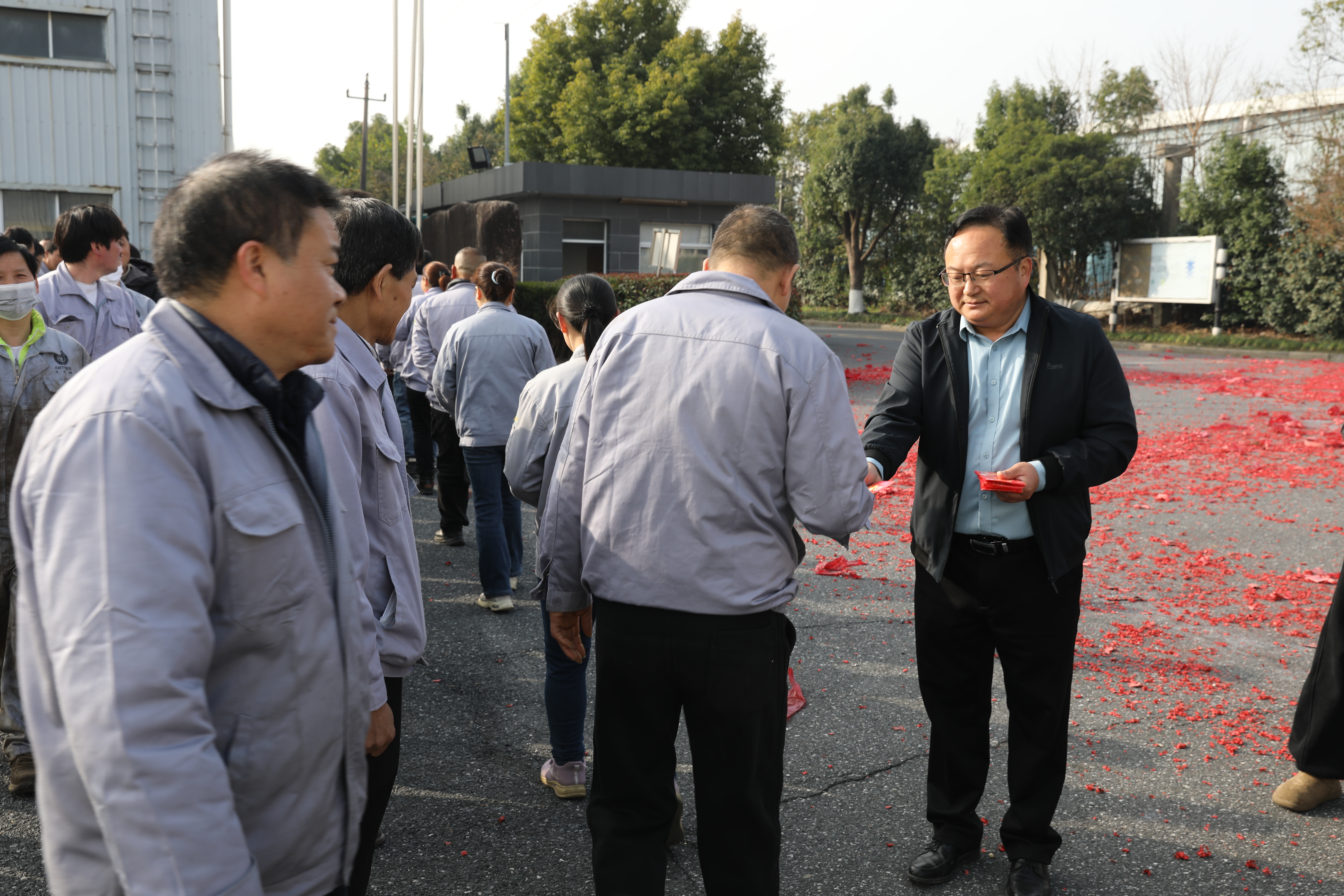 清晨,浙江良友木業(yè)制造中心總經(jīng)理、大藝樹地板副總經(jīng)理袁福堂便守候在生產(chǎn)基地門口與車間一線,迎接遠(yuǎn)道而歸的“大藝樹家人”。為了感謝一線員工在過(guò)去一年的辛勤付出,并激勵(lì)大家在新的一年里再創(chuàng)佳績(jī),袁種親自將一個(gè)個(gè)寓意吉祥、承載著公司關(guān)懷的“開工利是”紅包遞到每一位生產(chǎn)線員工的手中。